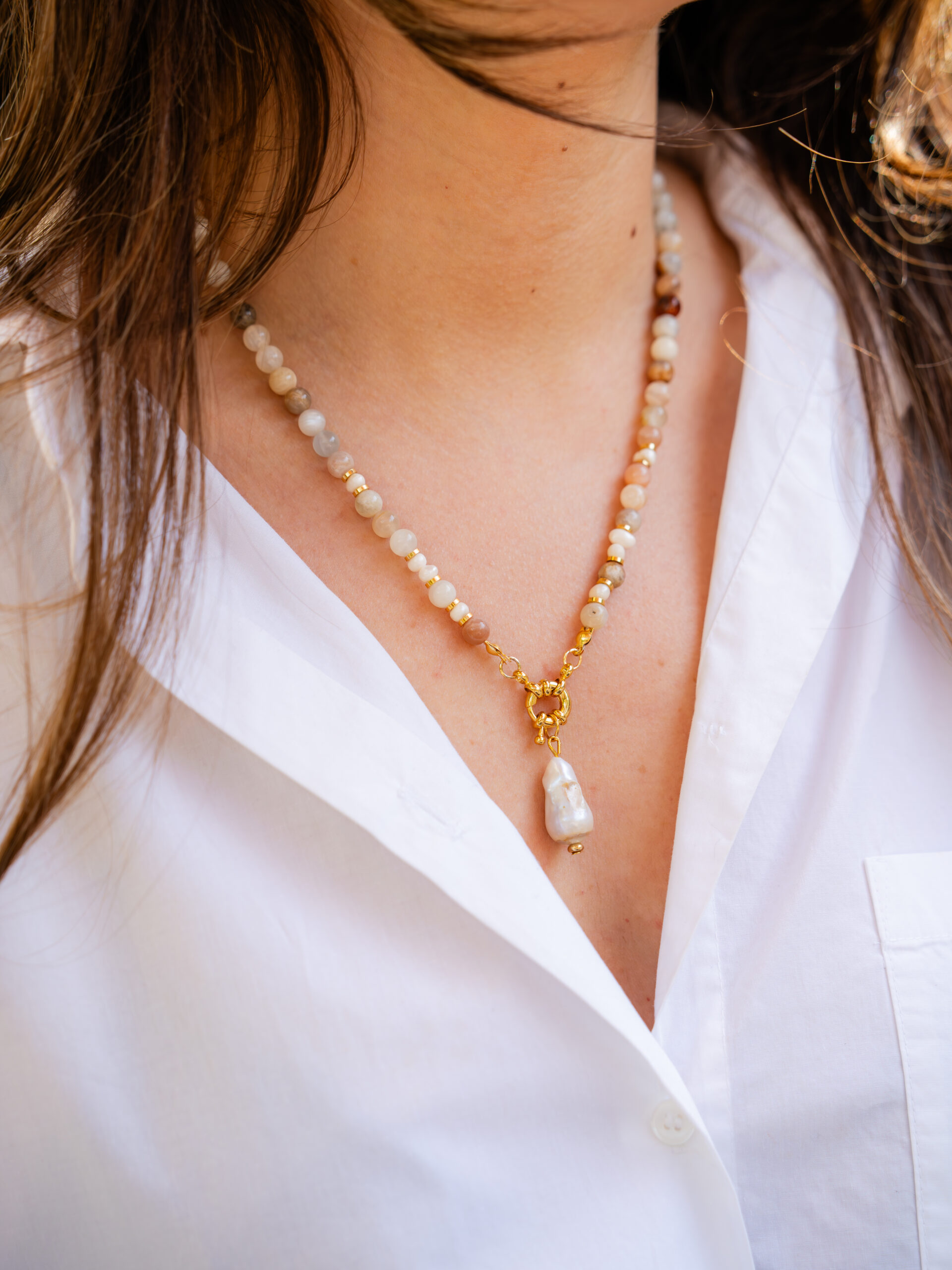 Doğal güneş taşı ve barok inci kullanılmıştır.