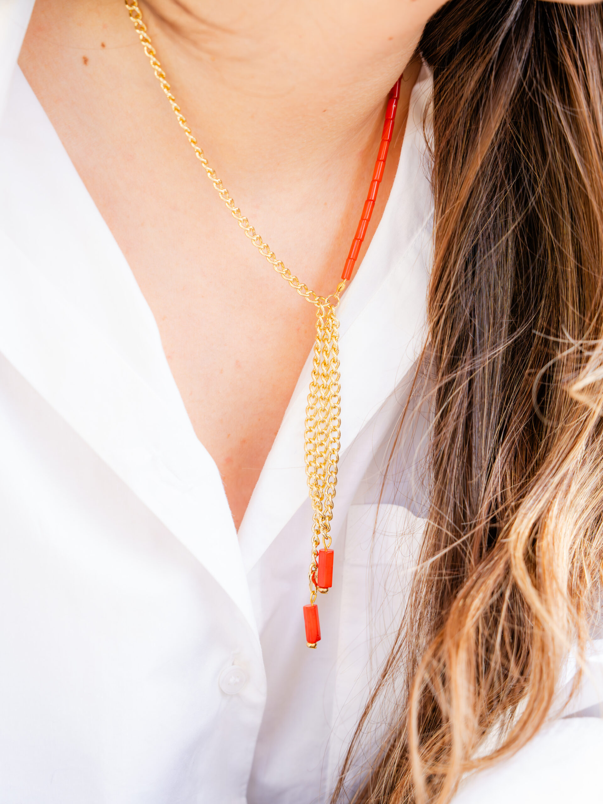Doğal mercan taşı kullanılmıştır. Kullanılan zincir markası xuping olup, kararma yapmamaktadır.