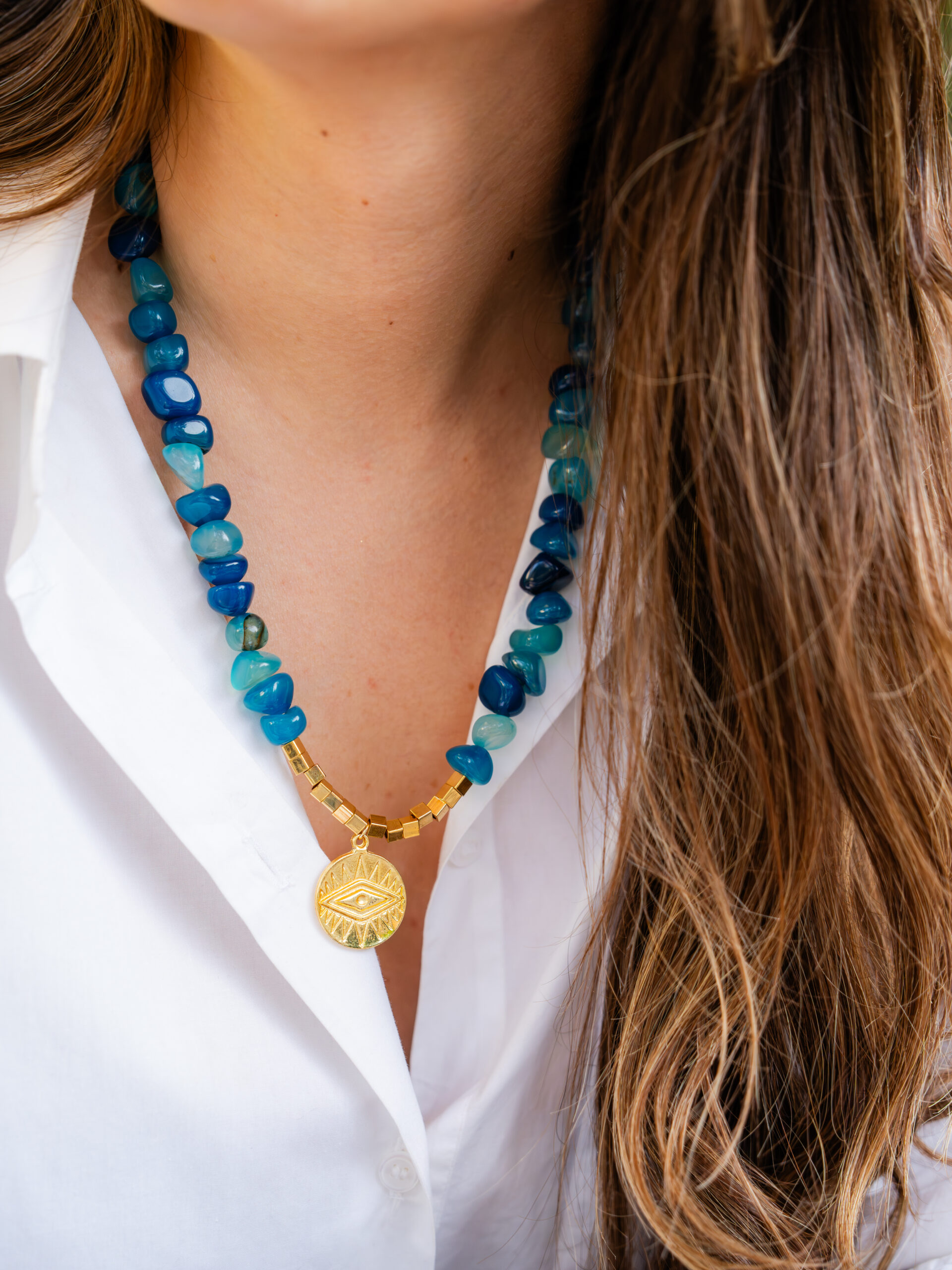 Doğal mavi riyolit taşı kullanılmıştır. Kullanılan materyaller çeliktir. Kararma yapmamaktadır.