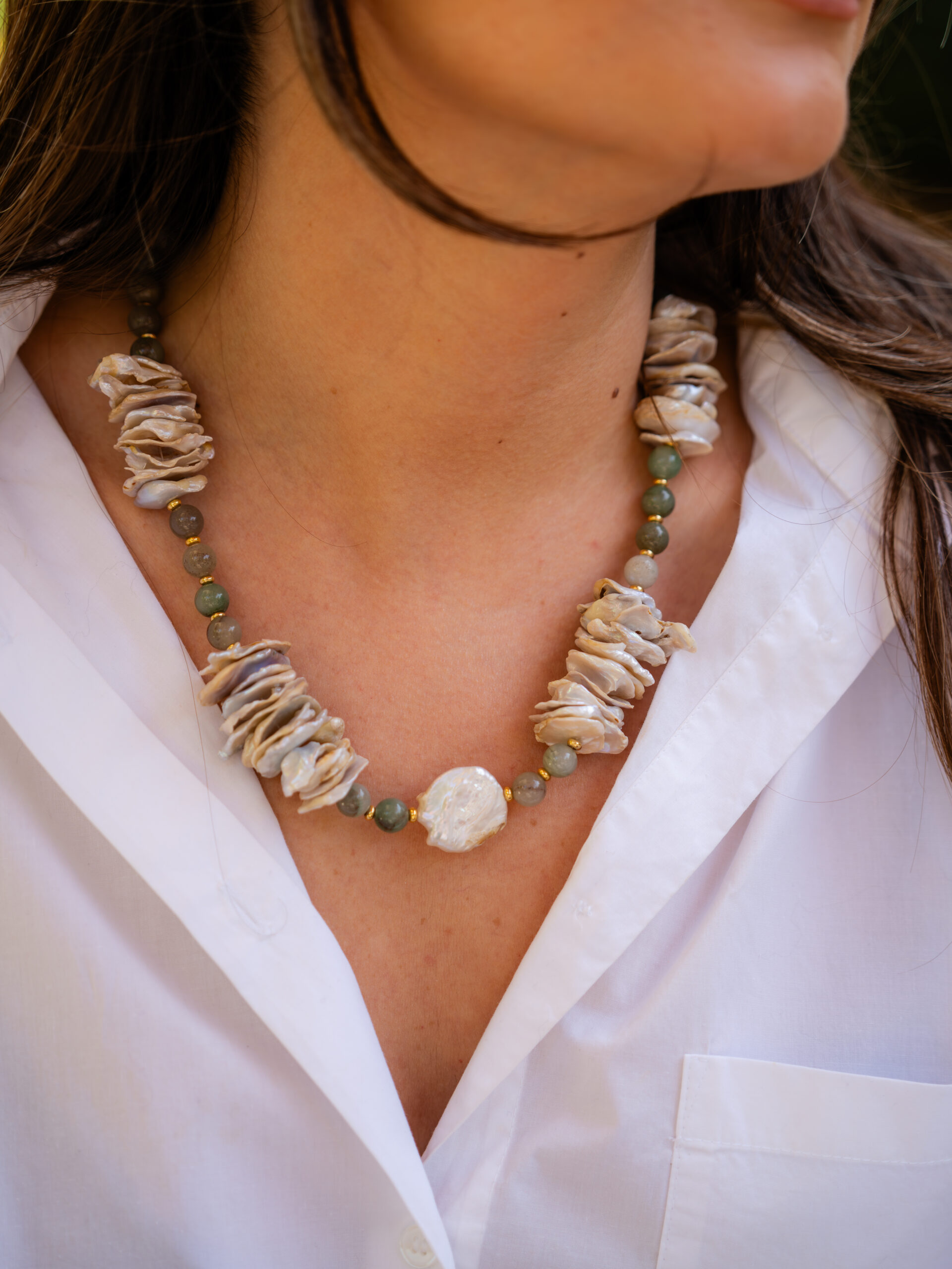 Doğal aventurin taşı ve barok inci kullanılmıştır. Kullanılan materyaller çeliktir, kararma yapmamaktadır.