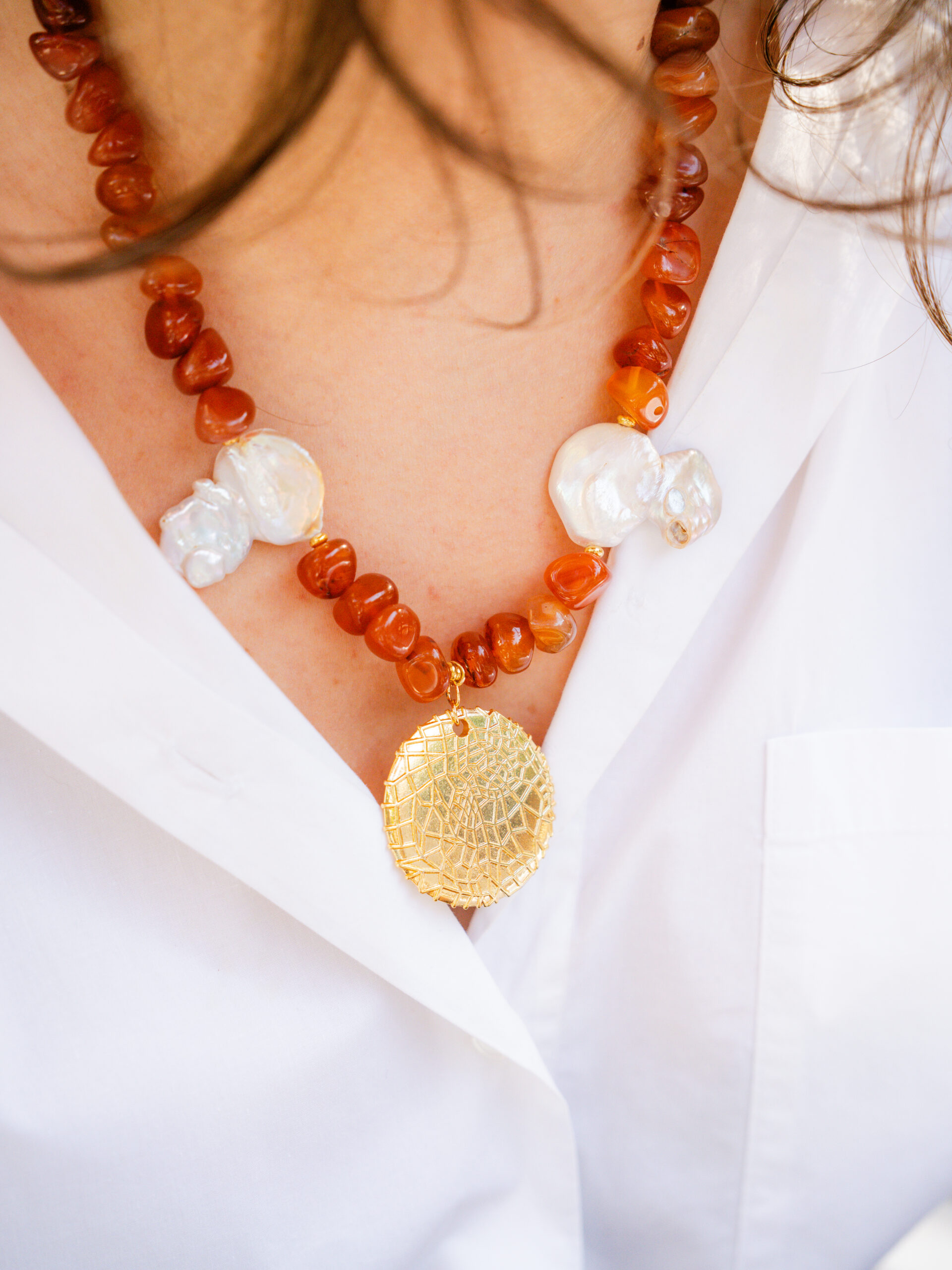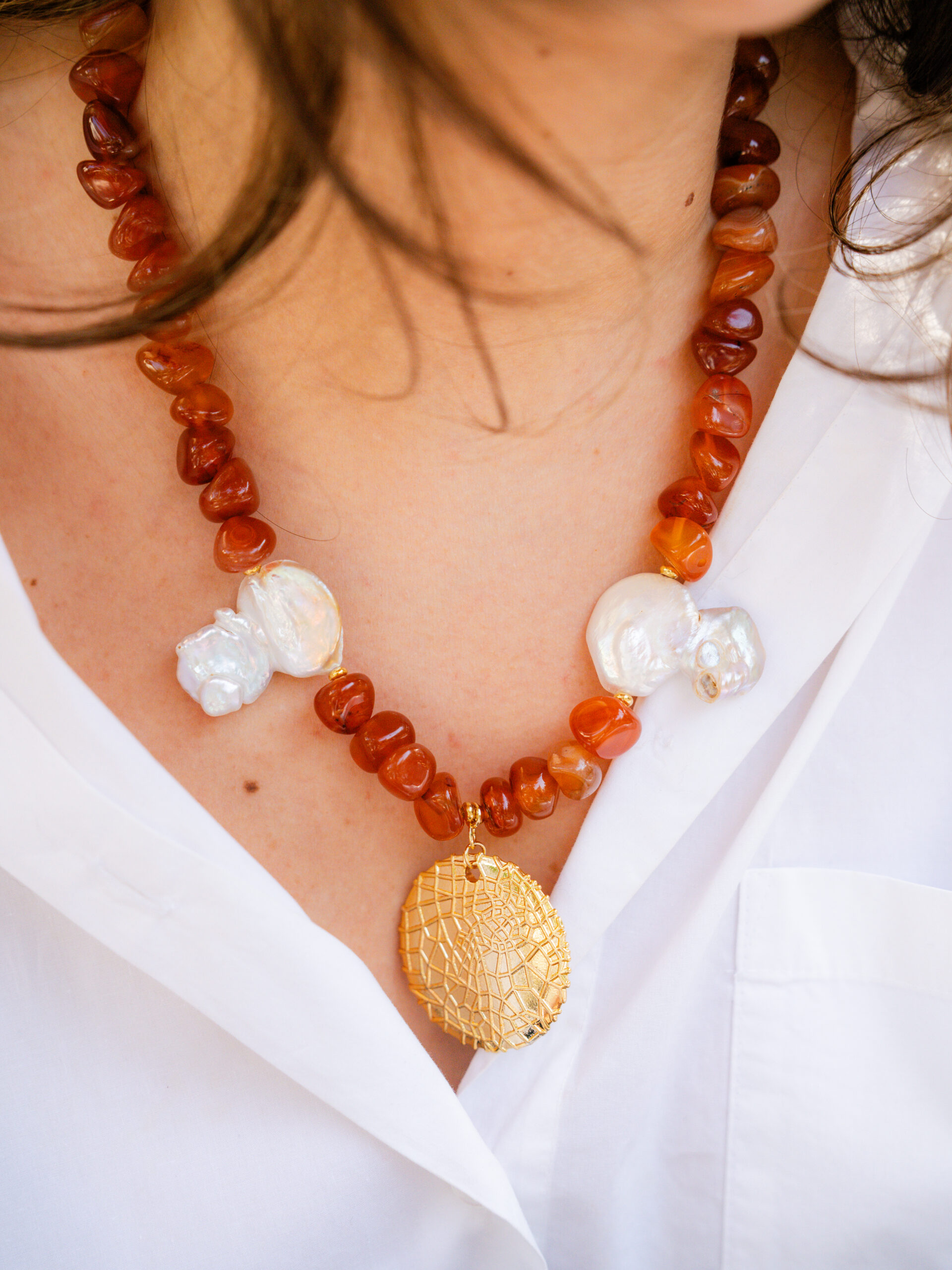Doğal kahverengi riyolit taşı ve barok inci kullanılmıştır.